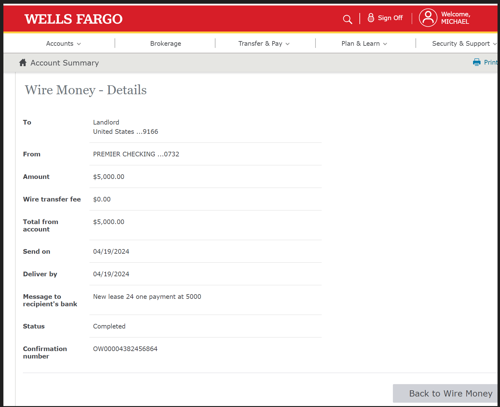 On April 19, 2024, the tenant transmitted a $5,000 Wells Fargo wire to satisfy the first payment of the Year-3 lease term. This payment was delivered, logged, and acknowledged by the owner’s agent. Despite this, the owner later represented to the Court that “no payment was received,” using the fabricated non-payment narrative as grounds for eviction.
