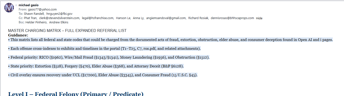- Statutory index cited in pleadings, including 18 U.S.C. §§ 1341/1343, 1961–1964 and California authorities referenced in filings. Any reference to “RICO” is limited to legal theories pled or to be pled; no ex parte merits argument is made here.