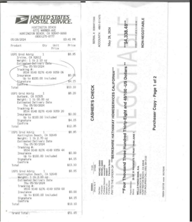 - USPS Tracking: 9534 9148 8276 4149 9359 06 (Irvine destination)