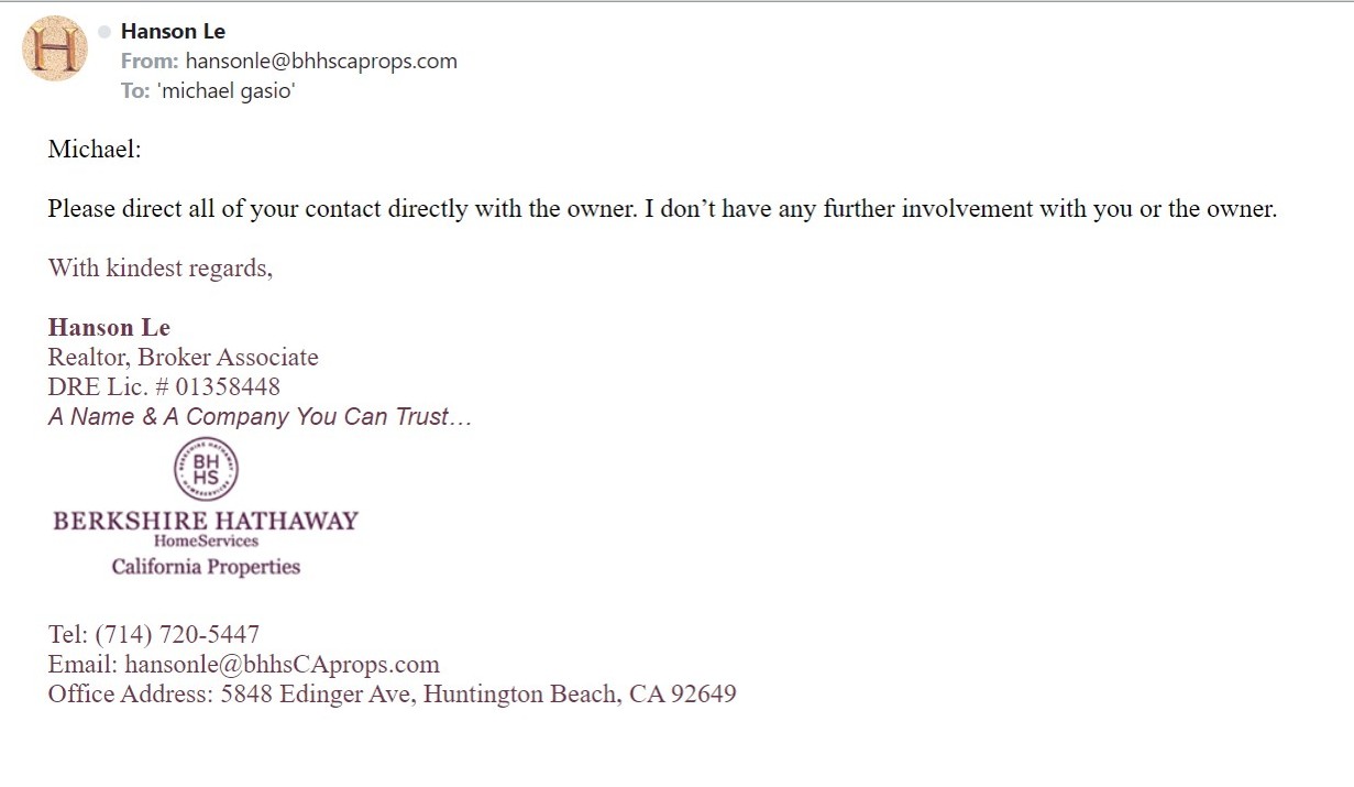 Image above shows Hanson Le acted for both tenant and landlord under Berkshire Hathaway’s license. He signed as agent on April 26, 2024, with dual representation at 5848 Edinger Ave, Huntington Beach.