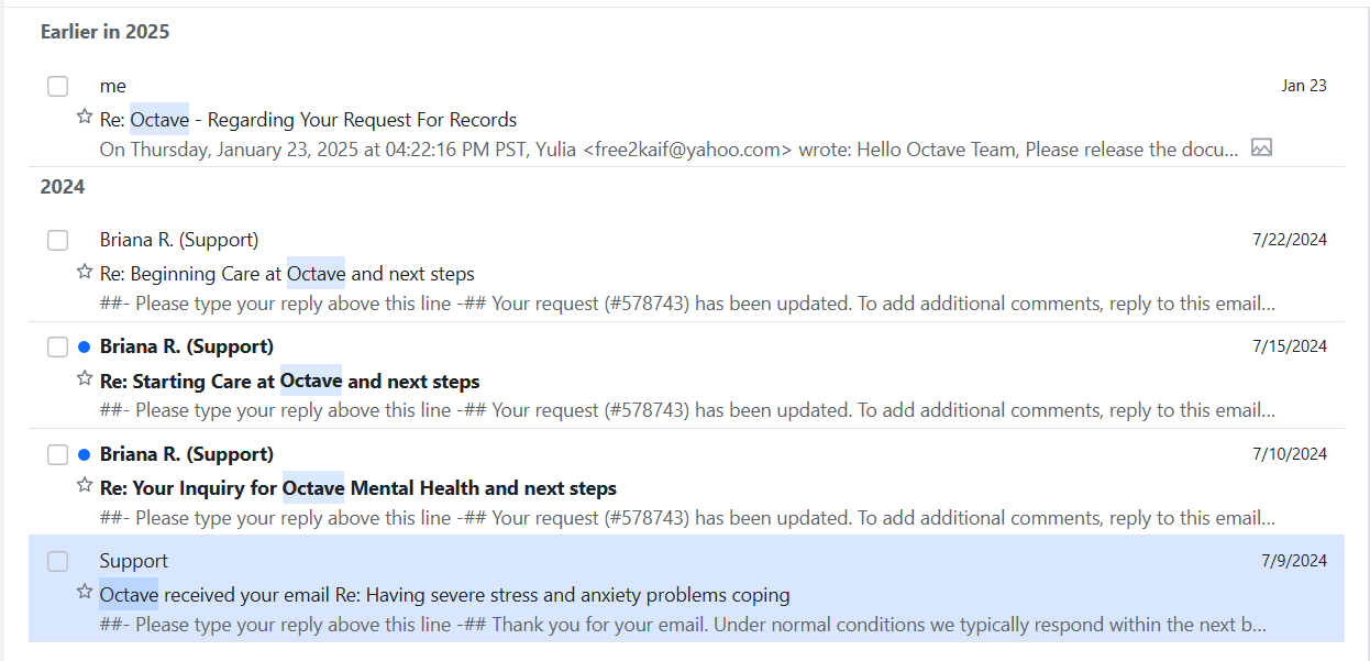 Mental health treatment authorizations and Octave therapy records.