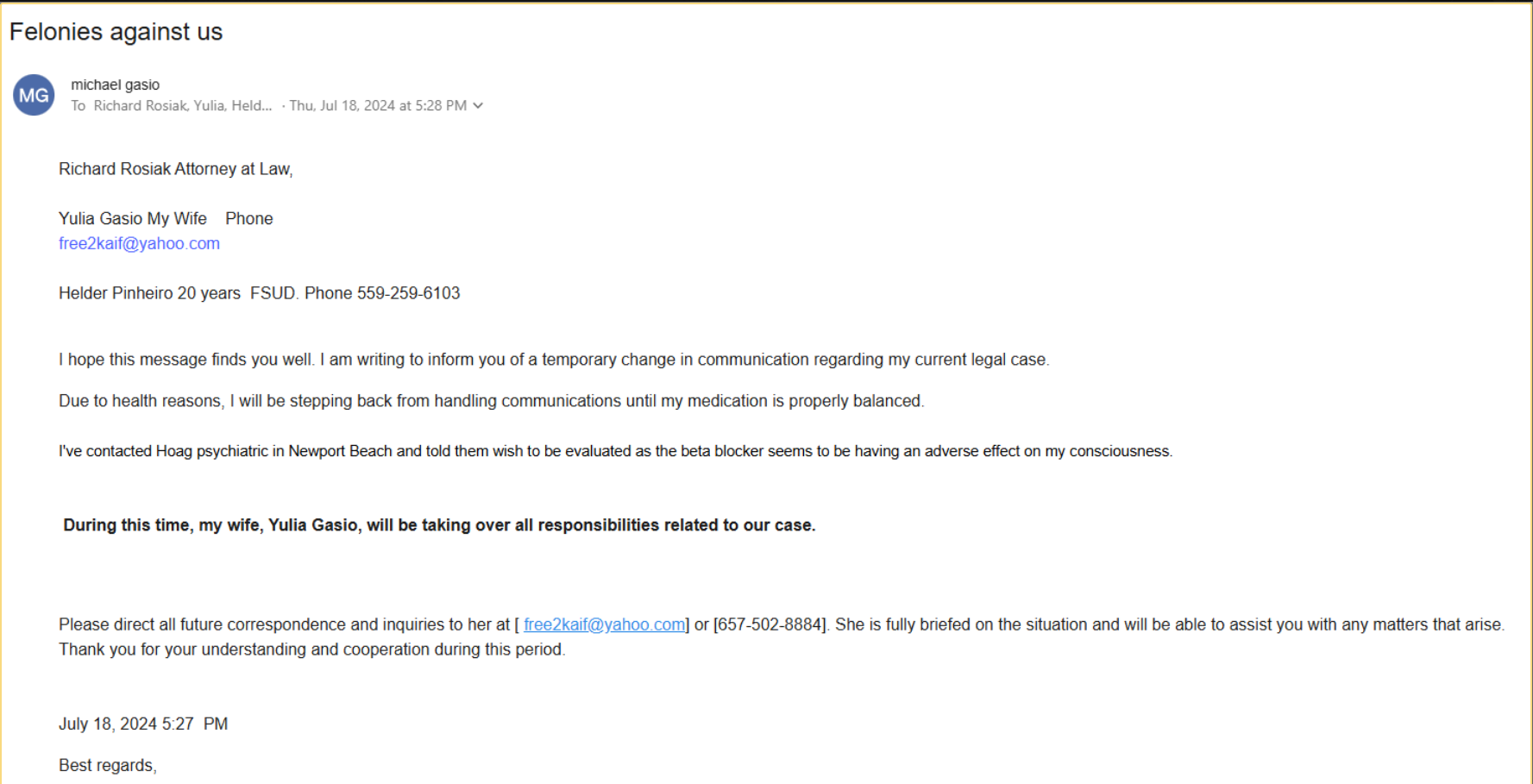 Email showing wife's takeover of communications due to Michael’s mental/physical state.